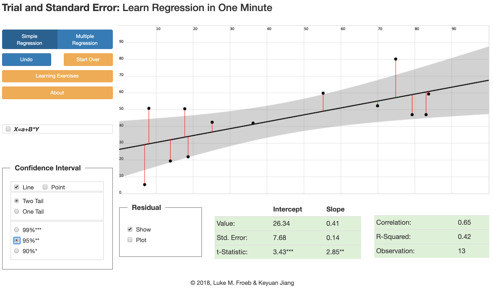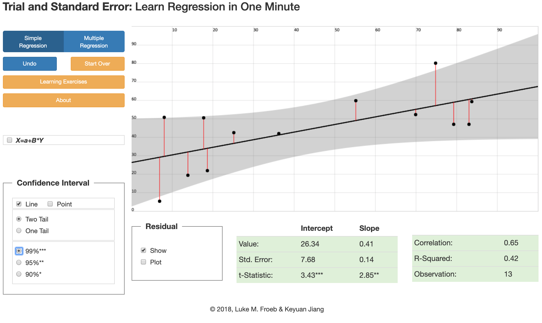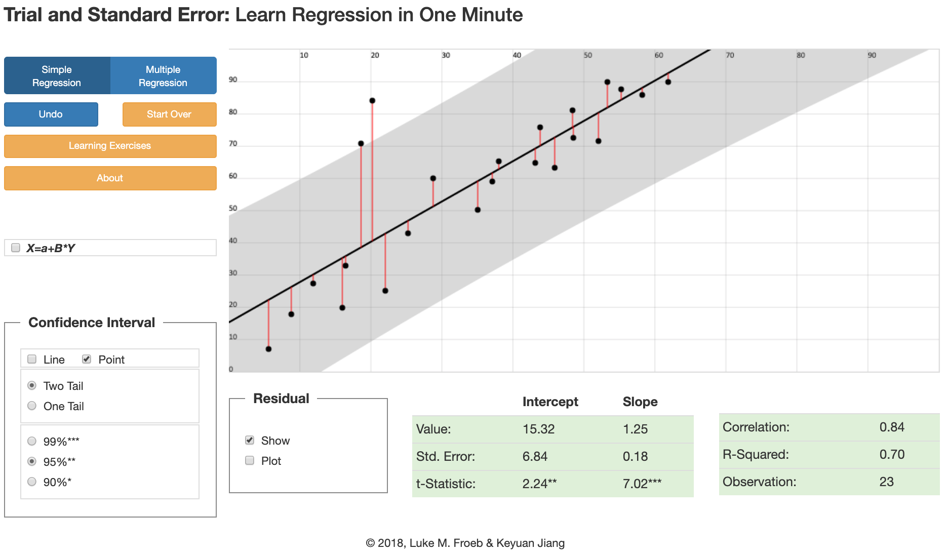 HISTORY: This program was originally written in Hypercard by Luke Froeb in 1988 to teach Justice Dept. attorneys enough about regression to allow them to cross-examine rival experts. Keyuan Jiang kjiang@pnw.edu then ported it over to Visual Basic and dramatically improved its look and feel. Taylor Jones tjonesster@gmail.com and Gray Curtis made it into a web app, and all four of us continue to update it.