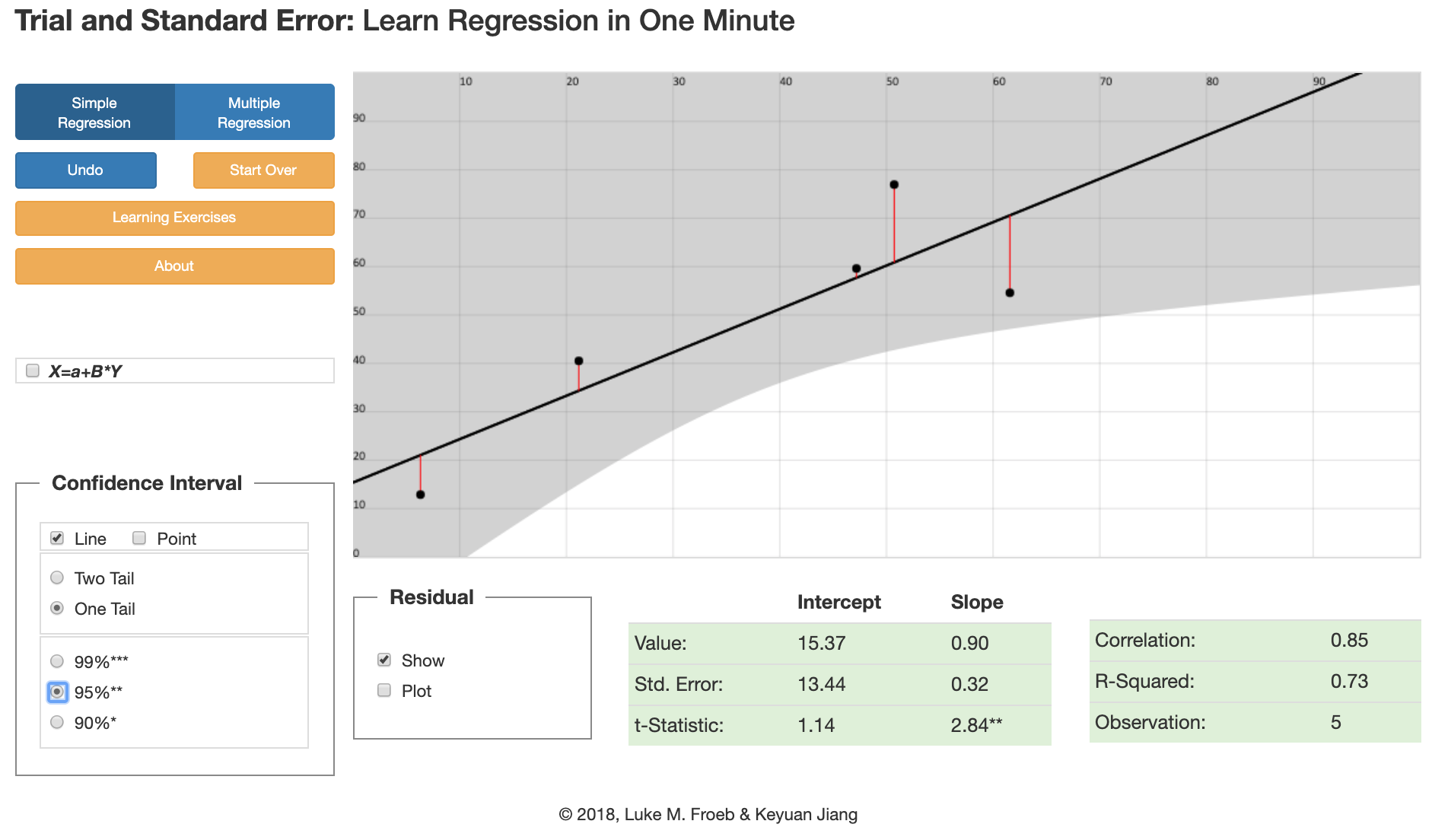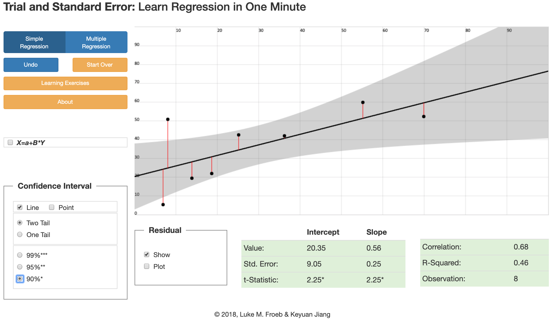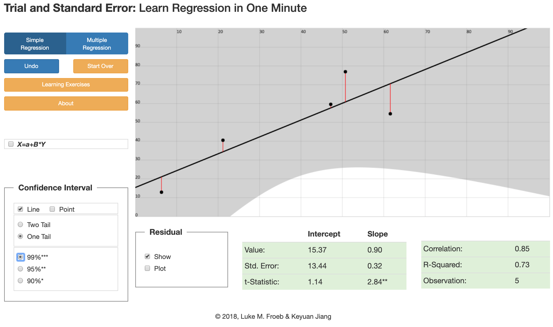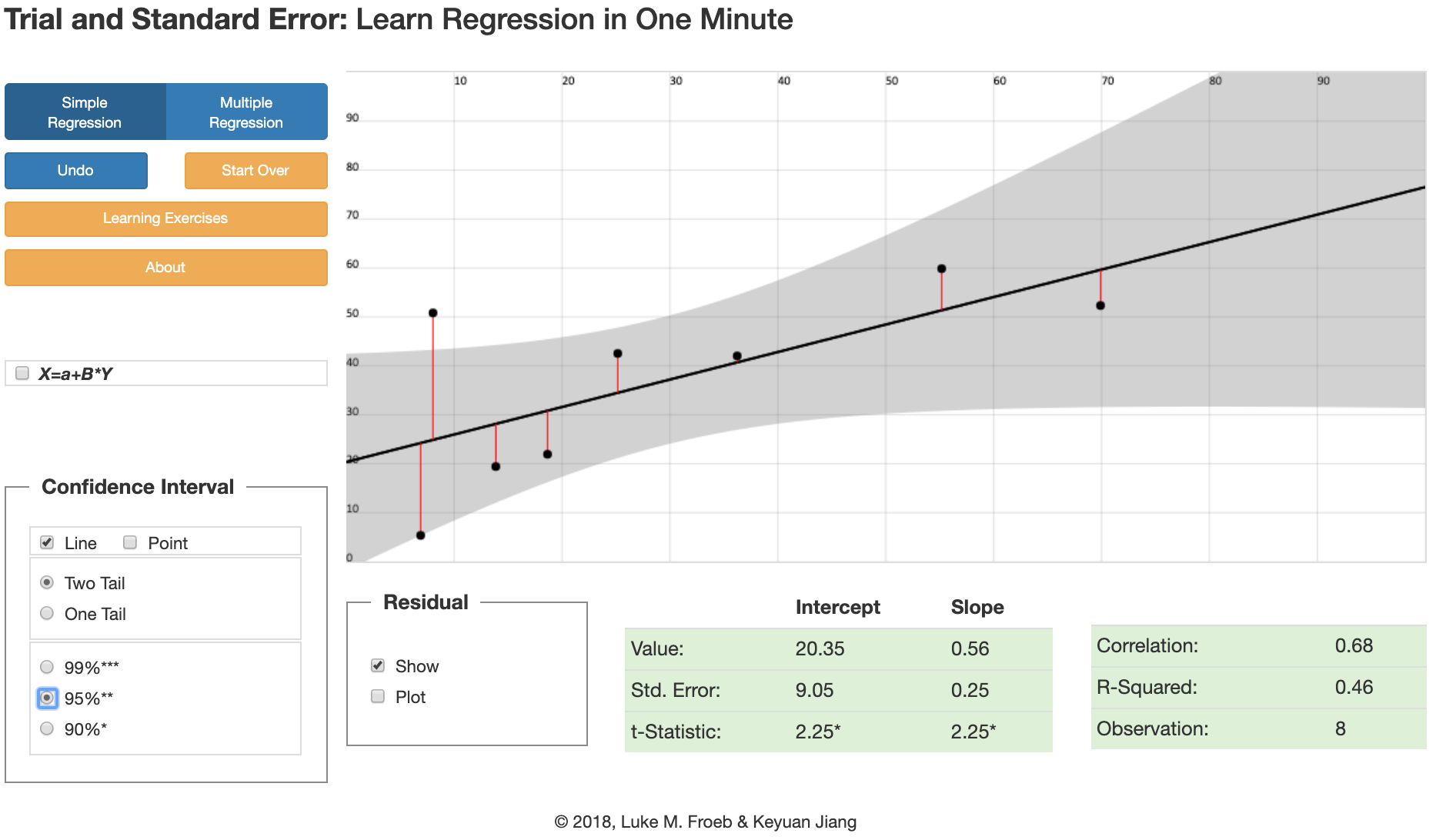 HISTORY: This program was originally written in Hypercard by Luke Froeb in 1988 to teach Justice Dept. attorneys enough about regression to allow them to cross-examine rival experts. Keyuan Jiang kjiang@pnw.edu then ported it over to Visual Basic and dramatically improved its look and feel. Taylor Jones tjonesster@gmail.com and Gray Curtis made it into a web app, and all four of us continue to update it.